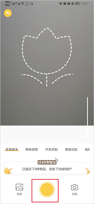 2、将待识别物体(如植物)对准界面中的虚线框,调整角度确保清晰取景后,按下拍照键。