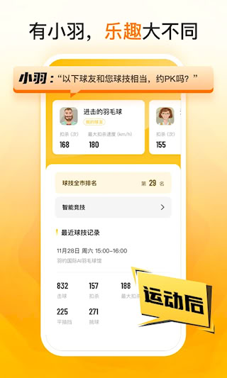 1、智能助手“小羽”全程陪伴运动过程,从前期的组局、订场、约人,到活动中的记录分析,再到活动后生成报告并发起新挑战,它把原本分散的各个环节串联起来,形成流畅的运动体验。
