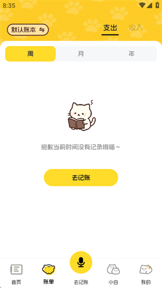 4、收支情况会自动统计,在账单页面能查看周、月、年不同周期的账单。