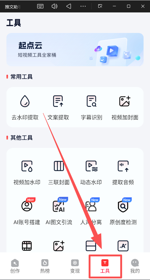 在发现页面的工具列表中,定位并选择「去水印提取视频」功能模块。