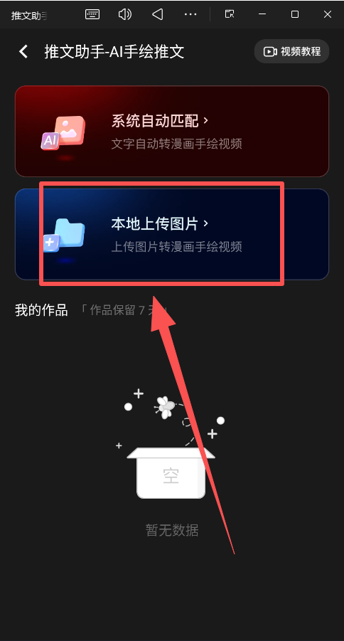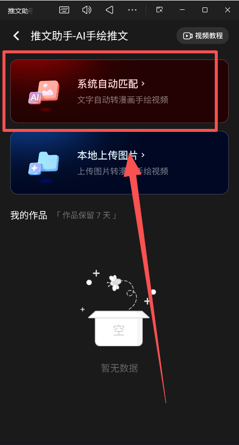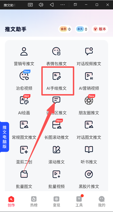 打开手机端的推文助手应用程序,进入主操作界面。本教程以制作漫画风格小说推文为例,请选择「AI自动生成图片」功能模式。