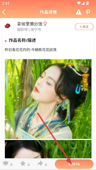 4、找到喜欢的作品,点击进入,右下角有【约拍TA】,点击之后就可以找到喜欢的摄影师啦