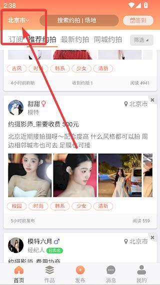1、打开咔咔约拍,首页左上角先设置好约拍城市