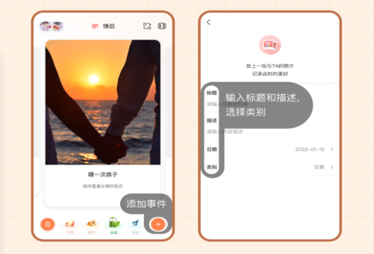 点击首页下方“+”图标添加事件,输入标题和文案即添加成功,并可在“甜蜜空间”中可查看添加的事件。