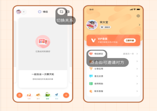 在“我的”、“邀请”栏可邀请对方,点击右上方图标即切换关系,在“我的”、 “个人资料”中可解除绑定。