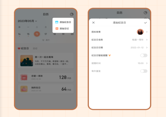 3、 日历工具支持设置重要日期提醒,并具备日记功能,便于随时记录日常相处的点滴想法与心情。