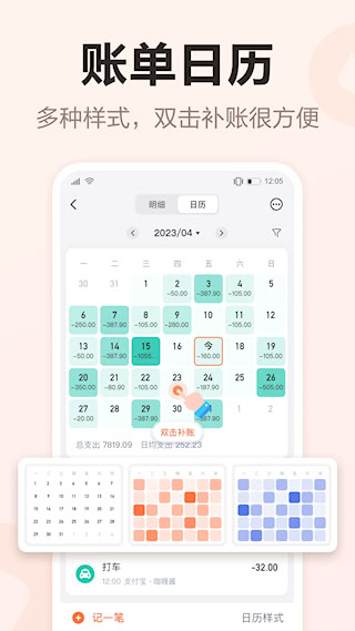 5、提供日历式账单视图,四种展示模式直观呈现每日收支情况
