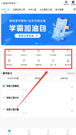 1、章节练习的分类十分清晰,既支持按照知识点刷题,也可以按章节刷题,用户能够自主挑选需要加强的部分开展集中训练,从而提升学习效率和针对性。