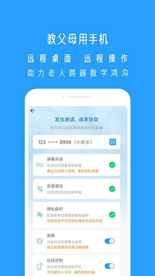 1、独创的"观看模式"与"控制模式"一键切换设计。被协助方可随时收回控制权,既保证效率又确保设备安全。