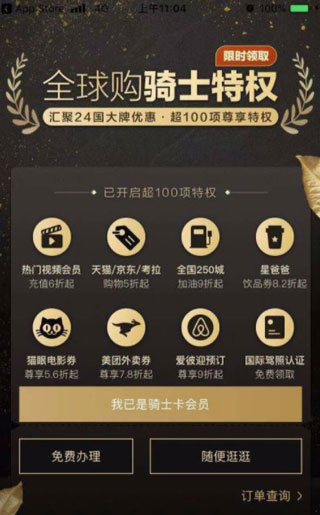 全球购骑士特权现已整合了众多优质的全球专属权益,其中包括热门影音会员充值低至6折、全国62座城市的加油站加油享9折起优惠、贵宾休息室9.9元即可体验、在网易考拉购物能获得4%的返现等,并且还会不断新增更多独家权益。