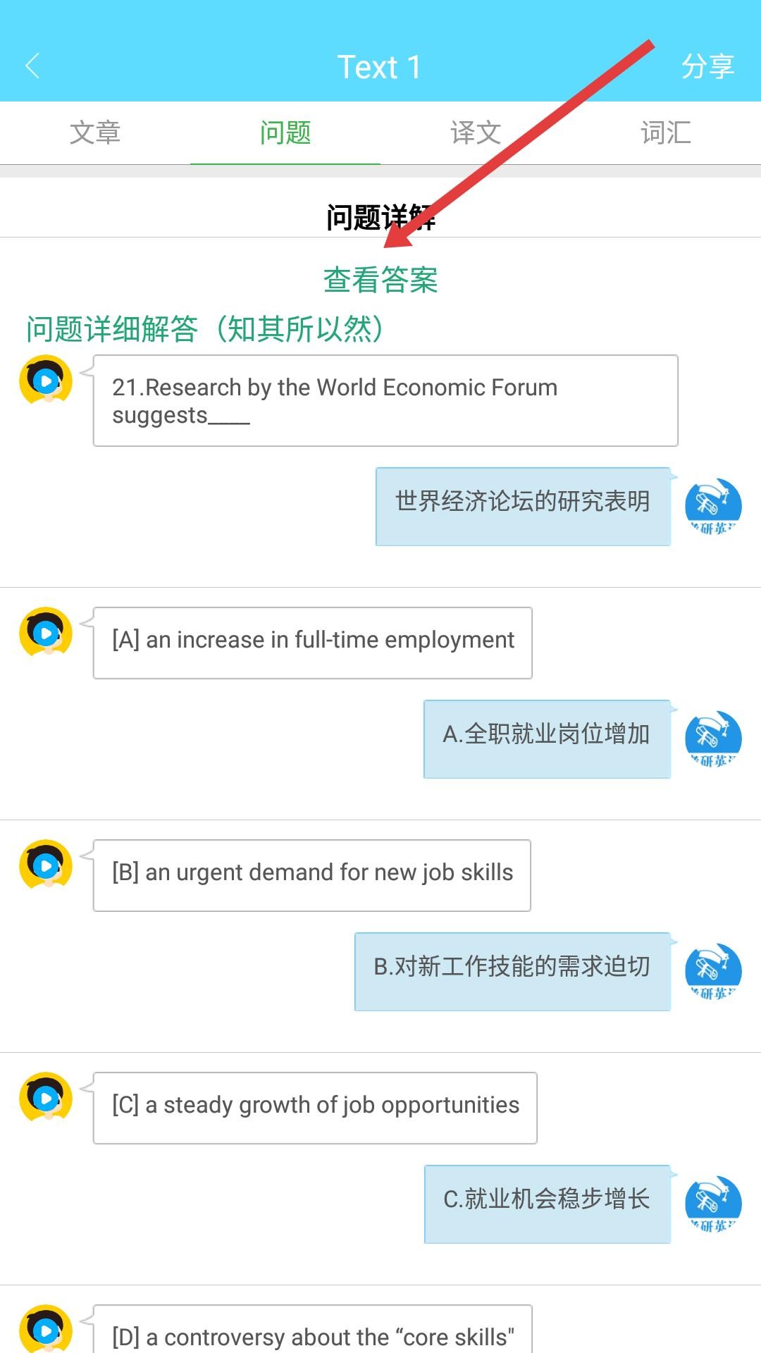 3、真题解析页面,针对阅读等题型给出选项的详细解析,采用中英对照的方式来阐释题意,考生点击查看答案就能知晓解题思路,助力考生彻底掌握真题,攻克知识盲点。
