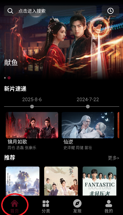 顶部搜索栏:点击进入搜索页面,快速查找影视内容