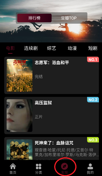 在发现页面查看热门榜单和豆瓣高分作品