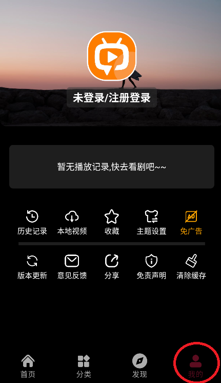 历史记录区域显示“暂无播放记录,快去看剧吧~~”