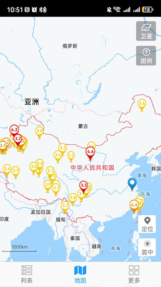 3、切换到地图视图能直观看到震中分布状况,图例框详细解释了各类符号所对应的震级范围。还支持通过手势缩放来查看不同精度的地理信息。