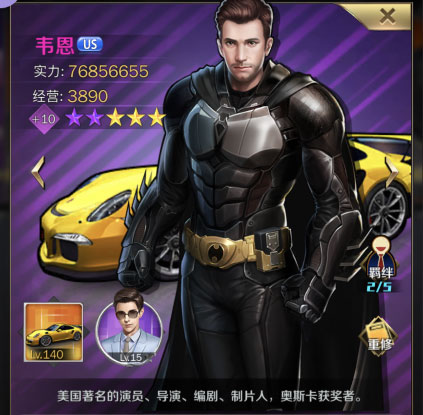 韦恩有着最强羁绊紫色人才的称号,在紫色人才里面是唯一一个具有5条羁绊组合的男人(当然女人里面也找不出),可以轻松凑齐韦恩+唐尼,韦恩+猫女,韦恩+周+强森+姜暮烟+钉宫这3条羁绊,唯一的缺点就是木有人才礼包这种额外获取人才碎片途径,游戏中只能依靠环球英才稳定获取碎片。