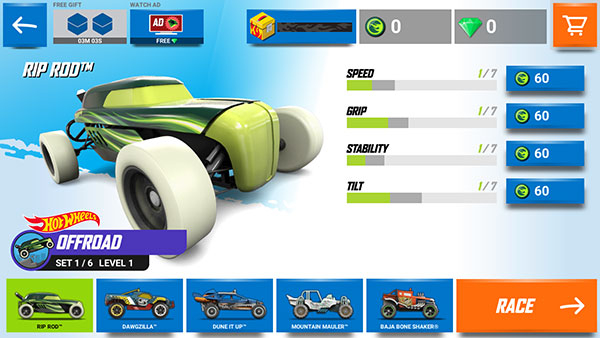 3、在此界面,能看到我们即将驾驶的赛车。若想切换赛车,点击下方的赛车图片即可;还能在右侧对赛车进行升级。一切准备就绪后,点击右下角的【RACE】按钮。