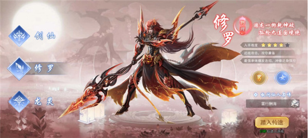 在游戏中,修罗属于物理输出型职业,擅长近战单体攻击,招式风格豪迈奔放,战斗时能很好地兼顾进攻与防守。修罗拥有所有职业里最强力的单体爆发连招,不仅能快速冲锋靠近敌人,还可施展强力控制技能,堪称破阵杀敌的不二之选。然而,这个职业的上手难度达到了四颗星。