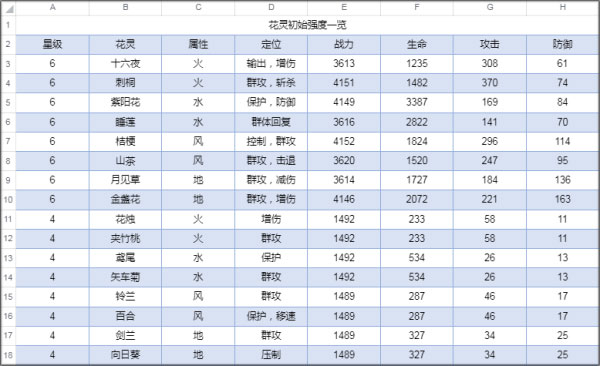 不难看出,4星花灵和6星花灵在数据上的差距十分明显。4星花灵就算满破,最高也只能到10星,这极大地限制了它的上限。因此,要是并非钟情于某个特定的4星花灵,还是建议大家重点培养6星花灵。