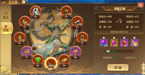3、获取天工石的方法:每日刷普通副本达30次,便能获取大量装备。将这些装备分解,可得到众多天工石,若条件允许,最好刷满30次。在前期,通常绿色装备直接卖掉换银子,蓝色装备则分解以获取天工石。当天工石全部提升至10段后,刷到的所有装备都能用来卖银子了。