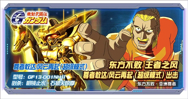 典藏新机尊者敢达/风云再起(超级模式)携手典藏老牌机体神敢达/明镜止水一同登场,师徒二人再度并肩作战!这两款机体的技能紧密相连,同时出场时,能爆发出最为强大的实力。