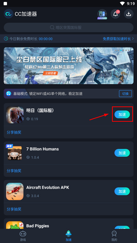 1. 于本站下载并安装明日手游,此游戏启动时需要借助加速器。打开CC加速器,在其中找到该游戏,然后点击游戏右侧的加速按钮。