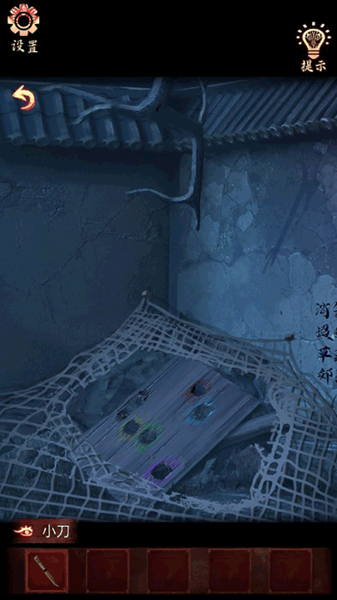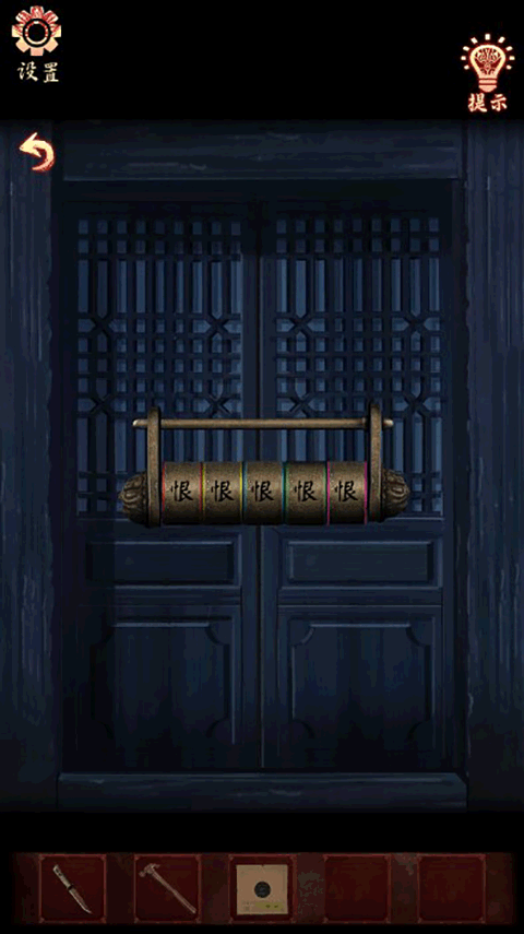 5、点击墙上的字,把【带孔木板】放上去,从而获得线索(霸 - 黄色、恨 - 绿色、楚 - 红色、魂 - 蓝色、漢 - 绿色)