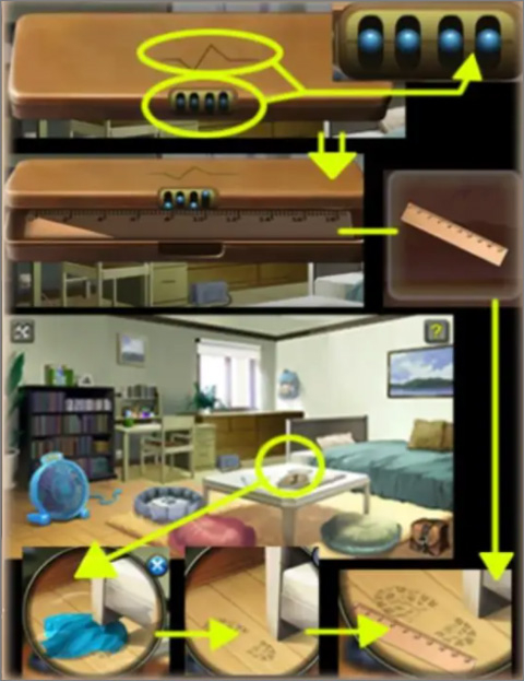 5、根据文具盒上的图案的提示,输入密码打开文具盒,得到直尺。点击床的右则,掀开布,使用直尺量脚印。
