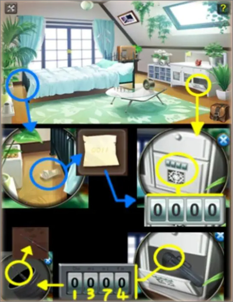 1第一步,点击获取主场景左侧床底下的纸条。随后,点击主场景右侧的柜子,并在柜子上输入密码0011,柜子打开后,点击柜子里的黑色筒,接着输入密码13741将黑色筒打开,最终点击就能获得鱼竿。