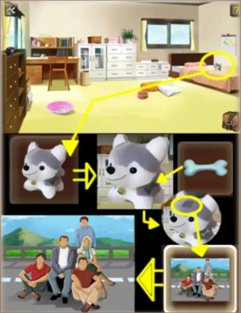 6、点击床上的狗玩偶,使用骨头点击玩偶,得到照片(隐藏道具)