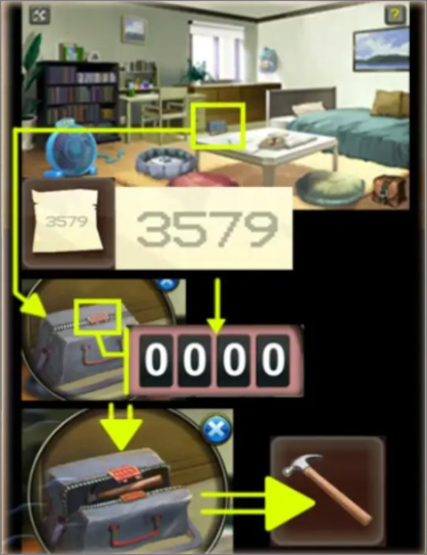 3、点击窗子下方的工具箱,根据得到的纸条提示,输入密码打开获得锤子。