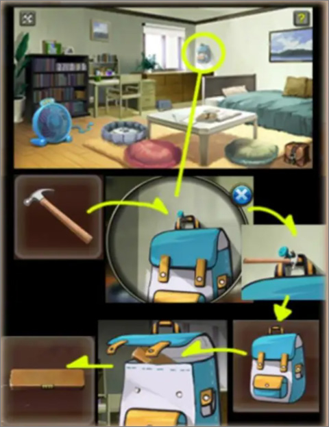 4、点击书包,使用锤子除去书上的钉子,获得书包,打开书包得到文具盒。
