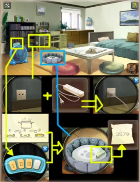 2、轻轻触碰电风扇的上侧,按照纸条提示的内容,依次点击2档、1档、3档。这时,电风扇内部的纸条会被吹到狗窝位置。紧接着再次点击狗窝,就能拿到纸条,之后认真查看纸条上显示的内容。