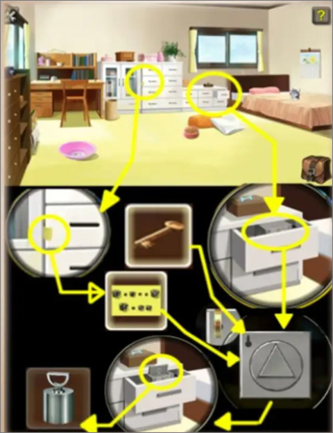 4、轻轻点击位于中间抽屉上的黄色纸条,仔细留意纸条上字的大小。随后点击已拉开的抽屉,取出钥匙,按照纸条上字大小所提供的提示,依次点击图案锁上的各个形状,成功开启后便可获得砝码。