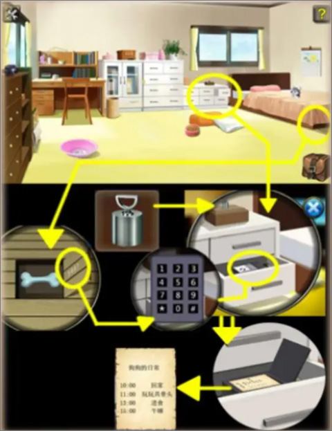 5、使用砝码,替换小骨头。第二层抽屉打开。输入密码5481打开得到“狗狗日常表”( ps 推测狗丢失的时间)