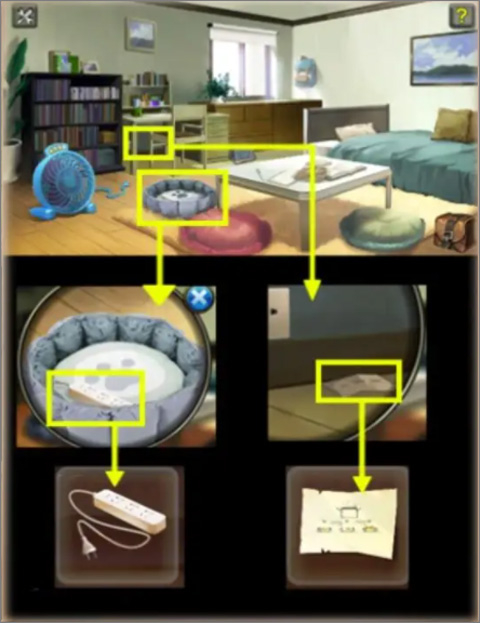 1、点击狗窝,获取插线板,点击书柜右侧桌子的下面,获取纸条。