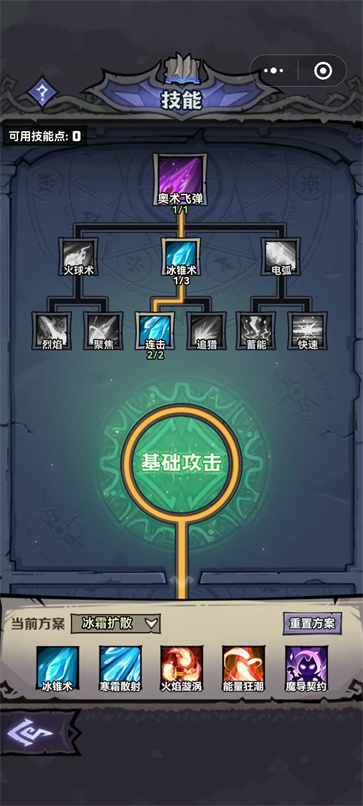 1在游戏里,所有技能都能够重置。要是你不想学某个技能了,随时都能去更改,而且无需消耗任何物品。游戏刚开局的引导阶段,在成功打掉一个boss之后,玩家就可以挑选初始技能。可供选择的初始技能有:火球术、冰锥术以及电弧,玩家只能从这三个技能中选取其一。其中,火球术的伤害最高,一旦击中目标还会引发爆炸,造成范围伤害。冰锥术的伤害比不上火球术,不过它在造成伤害的同时,能让敌人减速30%,也就是说,牺牲了部分伤害来提升生存能力。电弧的伤害提升并不明显,但它具备同时命中三个敌人的特性。