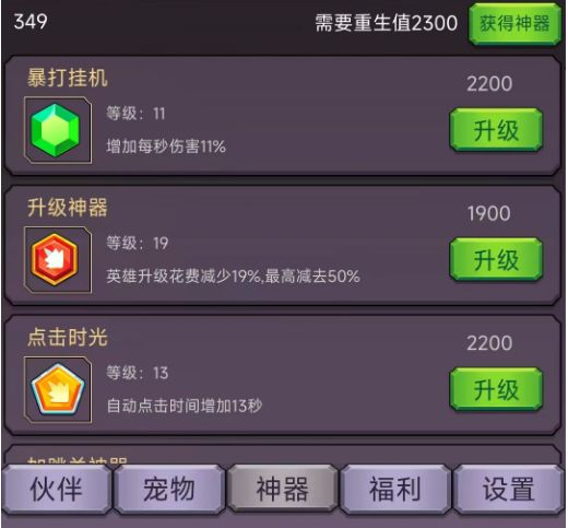 如图所示,伙伴可分为两类,一类是增加点击伤害的伙伴,另一类是增加主角攻击力的伙伴(就目前情况来看,好像只有第一个伙伴能增加点击伤害)。当金币足够时,便能够招募新伙伴,即图中的“获得”。