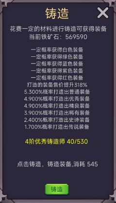 每次锻造,可提升铸造师等级,虽铸造师等级提升,可铸造出普通、优良.....传说等装备。
