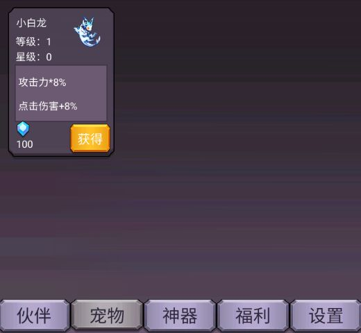宠物是提升攻击力、点击伤害、暴击值、暴击伤害、金币收入的主要手段之一,其获取途径为钻石。