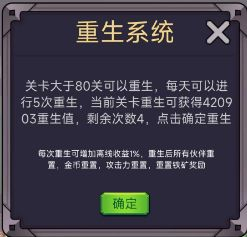 要实现重生,需满足通过80关后的相关条件,且每天仅有5次重生机会。一旦选择重生,关卡进度、伙伴状态、金币数量以及矿石奖励等都将被重置。每次成功重生,玩家可获取一定的重生值,这些重生值能够用来获取神器,还可对已拥有的神器进行升级操作。