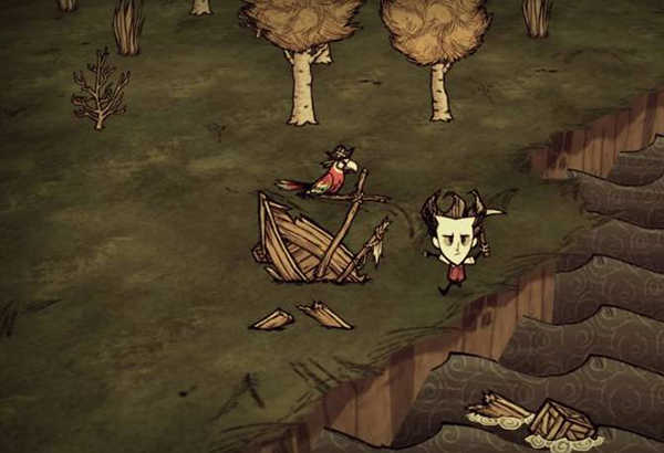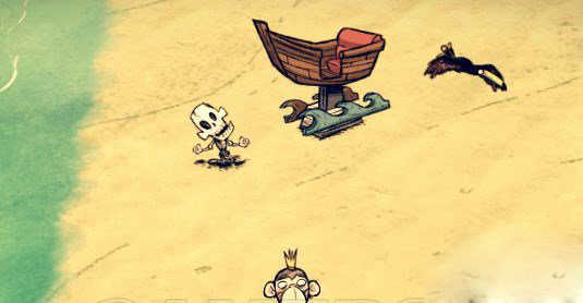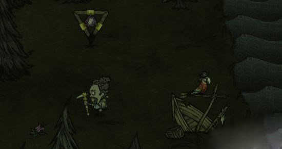 2、进入饥荒巨人国,然后在地图边缘上寻找沉船,沉船的特征是一半在岸上,一半是卡海里,船杆上停着一只戴海盗帽的红色鹦鹉。