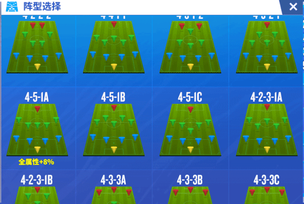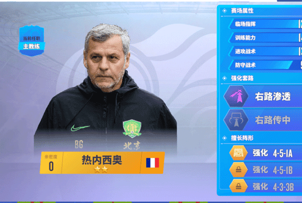 3、热内西奥会给使用4-5-1A阵型的玩家提8%的战力提升(如下图),当热内西奥升至3星时会解锁强化4-5-1B阵型8%的战力提升,当热内西奥升至5星时会解锁强化4-3-3B阵型8%的战力提升,是前期提升战力的有效方法。