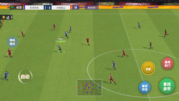 2、游戏过程中,并不是所有的玩家都会时刻处于顺风状态,有的时候我们也会处于逆风状态,被其它玩家抢走球之后,我们只能被迫进入防守,这个时候就要找机会进行反击了,要知道在防守的时候,我们会有四个按键。包括指挥上抢,指挥铲断以及切换人员和加速的按钮,这几个按钮玩家必须合理地利用,如果有操作不明白的玩家可以直接点击教练模式进入自动防守状态,不过这样的效率比较低,玩家们只能不断的进行防守,想要夺回球权的话,还是需要切换为手动模式。
