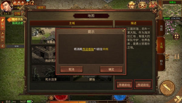 2、在选择主城后,点击你想要前往的主城,此时有两种前往方式可供选择:一是通过寻路前往,二是选择传送前往。