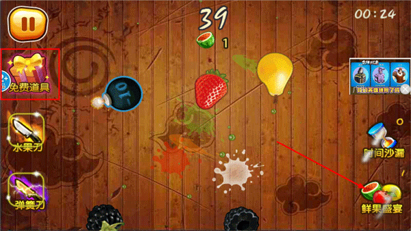 4、游戏开始后会有30秒倒计时,玩家通过手指滑动来切割水果,需避免切到炸弹。可以点击左上角的免费道具,获得鲜果盛宴效果,接着点击右下角的鲜果盛宴图标,即可快速完成第三关的水果切割任务。