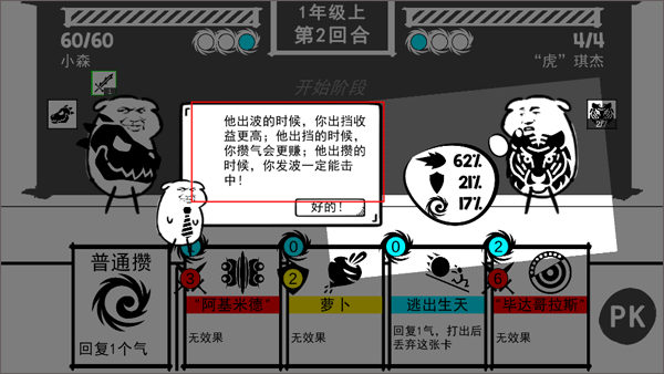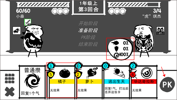 9、此时要根据对方当前所处的准备阶段,选择相应的攻击方式。选好卡片后,点击“PK”,就能快速进入PK阶段。加油,努力实现小学毕业!