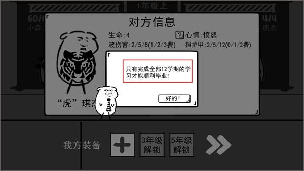 3、当玩家处于小学阶段,需要和相应的老师或同学进行PK,只有把他们全都打败,才能够升入更高的学籍。玩家必须完整度过全部12个学期,才可以顺利从小学毕业。