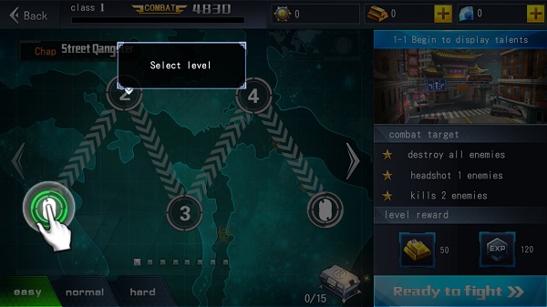 2、从图中可以看到,闪烁的区域是玩家能够选择挑战的关卡。在界面的最右侧,展示着通关奖励、星级目标以及作战场景。在闪烁区域的左下角,设有“easy”“normal”“hard”这三个难度选项,它们分别对应的是简单、普通和困难模式。