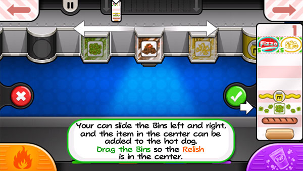 游戏有着难易程度之分。在游戏的初始阶段,制作热狗所需的食材种类不多,顾客需求比较简单,客流量也较小,所以前期制作热狗相对轻松,每个热狗都要玩家借助鼠标一步步完成。 但到了后期,热狗的食材配料种类增加,客人的需求开始改变,甚至还会出现用餐高峰期。在规定时间内,具体制作流程如下:先拿出一个热狗面包,然后把热狗的关键食材——热狗肠,放在烤盘上烤至成熟。烤制过程中一定要注意时间,不然时间太久热狗肠就会烤糊,将烤糊浪费的肠扔进垃圾桶会扣除金币收入。等热狗肠烤好后放在面包上,按照客户口味添加配料,例如喜欢加全料的,就把芝士、牛肉、番茄酱等放在上面,如果不喜欢其中某一种配料,去掉就行,最后放在装饰盒里,就能够拿给客户享用了。